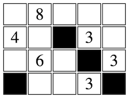 Range is yet another grid-based puzzle in which the user places black and white tiles. The initial grid contains some number of white tiles containing numbers, which specify the desired number of adjacent white tiles in that number's row and column. The user must place white and black tiles, with the black tiles serving as walls. In addition, no two black tiles can be placed adjacent to each other (horizontally or vertically). For example, 5x4 puzzle on the left is solved on the right. Note that the tile labeled 4 is adjacent to 4 white tiles: itself, one above, one below, and one to the right. Similarly, all of the other numbers match the adjacent white tiles in their row and column.