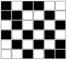 3-in-a-row is another puzzle in which the user must fill a grid, this time with colored tiles. When completed, each row and column must have the same number of black and white tiles, and neither color can appear three or more times consecutively (either horizontally or vertically). For example, the 6x6 3-in-a-row grid on the left has some black and white tiles initially placed (empty spaces are gray). When the puzzle is solved on the right, the empty spaces have been filled so as to meet the constraints.