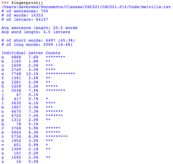 For this assignment, you will write a Python program that analyzes a text file and produces a report describing its literary fingerprint. The output of your code must include: