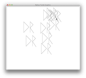 Hello, Little Turtles chapter of the online text contains numerous examples of using a turtle to draw patterns on a turtle graphics window. This last part will involve using a turtle to draw your initials using commands such as left, right, forward, up, down and goto.