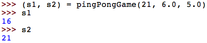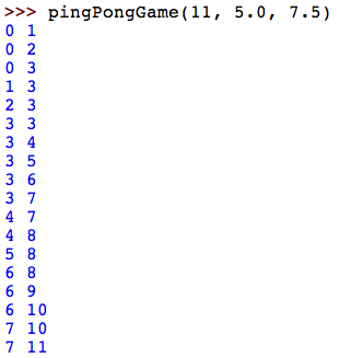 For many years, official ping pong (table tennis) games were played to 21 points. That is, a game continued until one player scored 21 points and led by at least two points. A match was typically two-out-of-three games. In 2001, the International Table Tennis Federation changed the scoring rules, moving to 11-point games and matches of three-out-of-five games (or sometimes four-out-of-seven). Their stated intent was to make games more exciting and also more TV friendly. For this assignment, you will develop functions for simulating ping pong games and matches, and collect statistics to help determine the effect of the scoring rules change.
