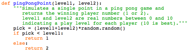 Assume that the two players in a ping pong game are each assigned a skill level from 0 to 10. The higher the skill level, the more likely that player is to win a particular point. For example, if player 1 and player 2 have identical skill levels, say 6.5 and 6.5, each is equally likely to win a given point. However, if player 1 has a skill level of 6.5 and player 2 has a skill level of 3.25, then player 1 is twice as likely to win a given point. The following Python function can be used to simulate a single point in a ping pong game.