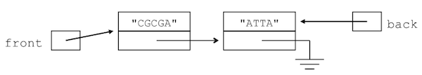 Internally, your LinkedString class should utilize a singly-linked list of strings, with references to the front and back of the list. For example, the string "CGCGAATTA" might be represented by the linked structure: