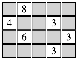 Range is yet another grid-based puzzle in which the user places black and white tiles. The initial grid contains some number of white tiles containing numbers, which specify the desired number of adjacent white tiles in that number's row and column. The user must place white and black tiles, with the black tiles serving as walls. In addition, no two black tiles can be placed adjacent to each other (horizontally or vertically). For example, 5x4 puzzle on the left is solved on the right. Note that the tile labeled 4 is adjacent to 4 white tiles: itself, one above, one below, and one to the right. Similarly, all of the other numbers match the adjacent white tiles in their row and column.