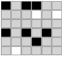 3-in-a-row is another puzzle in which the user must fill a grid, this time with colored tiles. When completed, each row and column must have the same number of black and white tiles, and neither color can appear three or more times consecutively (either horizontally or vertically). For example, the 6x6 3-in-a-row grid on the left has some black and white tiles initially placed (empty spaces are gray). When the puzzle is solved on the right, the empty spaces have been filled so as to meet the constraints.