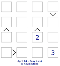 Futoshiki (also known as Unequal) is a Japanese logic puzzle game that appears in many newspapers, books, and Web sites (e.g., Futoshiki.org, BrainBashers). The goal of Futoshiki is to fill an NxN grid (where 4 ≤ N ≤ 9) with numbers so that no number appears more than once in a row or column. The grid may be partially filled with numbers at the start, and additional relational constraints may be placed on adjacent spaces, requiring one number to be larger than another. For example: