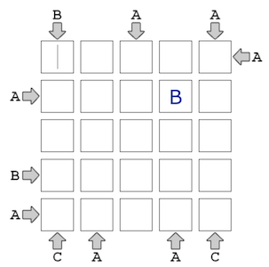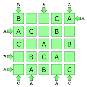 ABC View is a Japanese logic puzzle game featured on the BrainBashers site. The goal of an ABC View puzzle is to fill a 5x5 grid with the letters A, B and C, consistent with the edge constraints. An edge constraint specifies which letter must appear first in that row or column. Note that some of the letters may initially be filled in, and those letters cannot be changed. For example, the puzzle on the left is solved on the right: