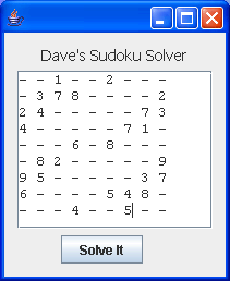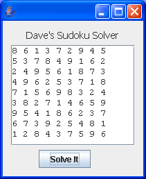 To complete your Sudoku solver, you will need to design and implement a class for representing a puzzle grid, including a method for solving the puzzle via recursive backtracking. You will also need to create a GUI for entering the initial board and displaying the solution. For example, an extremely primitve GUI might look like the following (with the initial configuration on the left and the solved puzzle on the right):