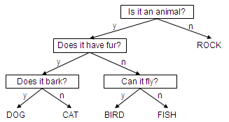 This classification tree can distinguish between five different objects. The initial question is stored at the root: Is it an animal? If the user answers "no," then the link at the right (labeled "n") is followed and the classification "ROCK" is determined. If the user answers "yes," however, the left link (labeled "y") is followed and another question is encountered to further distinguish among the options. Eventually, the answers provided by the users to the questions will classify the object.