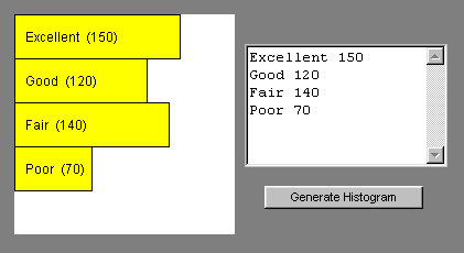 The Histogram class defines an applet for drawing histograms in a Web page. The idea is to have the user enter data in a textarea and then submit that data to the Histogram applet. The applet code will then parse the data and display the corresponding histogram. For example,