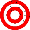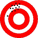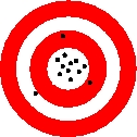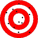 | Figure 1: Illustration of consistency and accuracy. The collection of dots on each target represents a data set with each dot representing an individual measurement. The bullseye represents the actual value being measured. The left column of targets shows two data sets containing consistent measurements, the top one is accurate and the bottom one is not accurate. In contrast the right column shows two data sets containing data that is not consistent. |